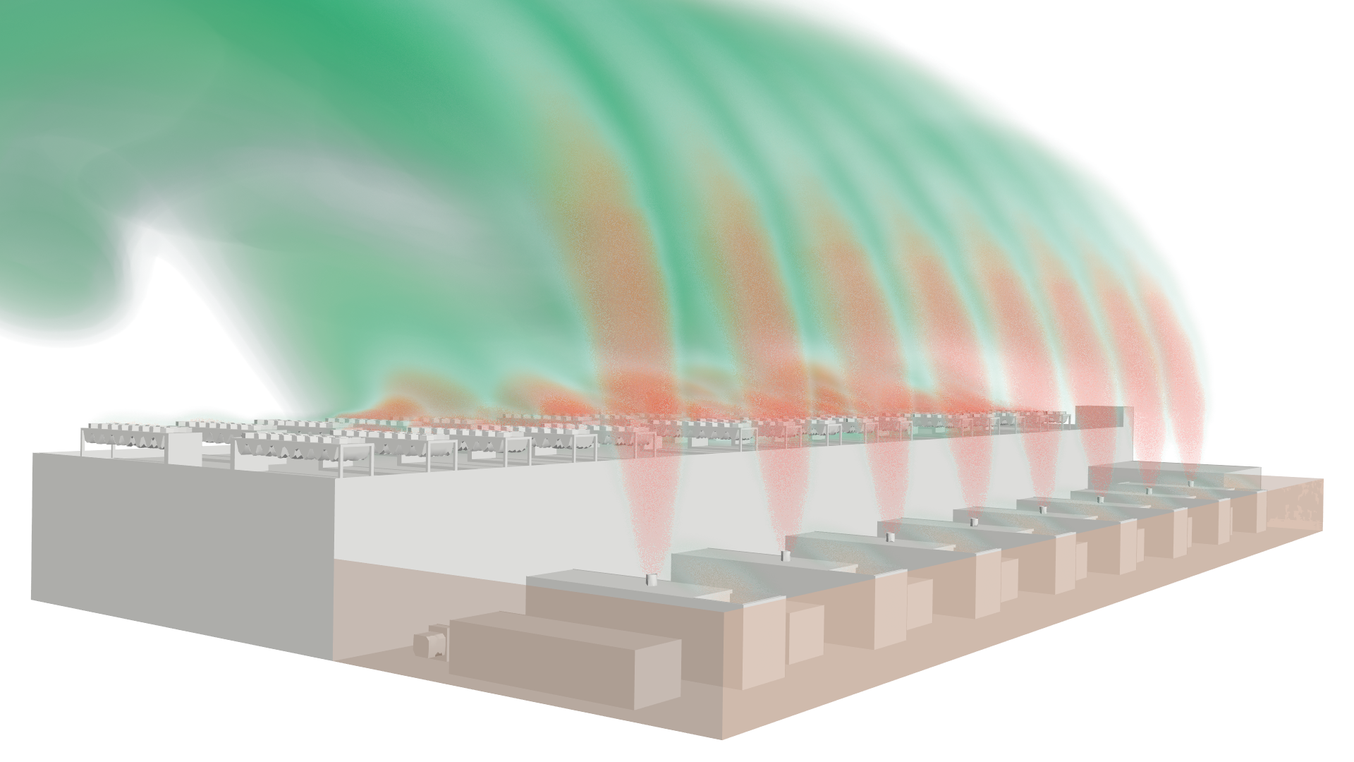 CFD simulation results showing the impact of wind on thermal exhaust plumes from data center cooling units. Understanding these patterns is key to optimizing equipment placement.
