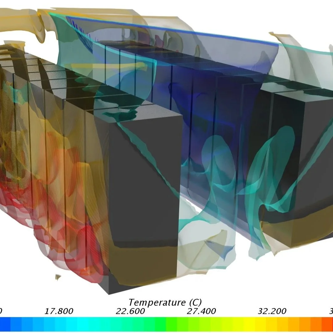 An animation from a Computational Fluid Dynamics (CFD) simulation of the open computer server architecture known as Barreleye. Streamline colors represent the temperature of fluid parcels as they pass through the server and absorb heat from the various electronic components.